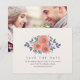 Notre sobriété et élégant enregistrer les cartes de dattes sont débordant d'élégantes flores aquarelles dans des tons chic de pêche corallienne. Le design comprend un spray de fleurs de pavot entouré de feuilles et de bourgeons en vert doux, gris et blues. Ajoutez vos noms et les détails mariages clés à l'avant, et ajoutez votre photo fiançailles préférée à l'arrière.