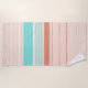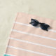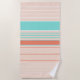 De couleur pêche prédominante, cette serviette de plage est tout rayé. Blanc, vert-bleu, orange brûlé.