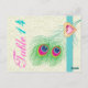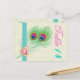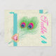 Carte postale de mariage de la table Peacock en plumes de plumes, avec une élégante plume paon en chaux et vert émeraude, bleu, turquoise et magenta/fuchsia rose chaud, bande de turquoise et illustration d'un diamant de bijoux de coeur rose avec silhouette or et strass sur arrière - plan damassé écru d'ivoire. Un design moderne et élégant d'un thème classique avec une légère touche vintage. Notez que le bijou en diamant du coeur est "imprimé sur" et non pas un vrai cristal, tout comme le strass. Cette conception peut être utilisée pour d'autres occasions, comme les anniversaires, les fiançailles ou les anniversaires.