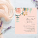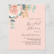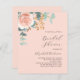 Un arrière - plan branché couleur pêche. Décoré d'or rose et de fleurs roses rousses, de fleurs roses et de feuilles d'eucalyptus vert aquarellés, de sprigs, de verdure et d'une fausse feuille d'or. Personnalisez et ajoutez le nom de la mariée à être et les détails du parti. Retour : arrière - plan de couleur pêche. 1 feuille = 1 invite imprimé bord à bord.