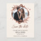 Un mariage simple et élégant Save the Date card avec une courre florale chic et un design de feuille d'or rose qui est facile à personnaliser avec vos détails. La carte a un style boho moderne, la calligraphie personnalisable, la police manuscrite, et un faire-part de mariage photo de couronne.