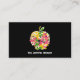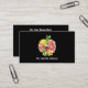 Un carte de visite pour des professeurs comportant une illustration d'une pomme couverte dans les éclaboussures roses, vertes, jaunes, et noires de peinture. L'arrière - plan est noir, texte sur l'avant et le dos sont blanc.