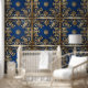 Peel and Stick Fond d'écran d'inspiration indienne design Rich Blue Gold Carré Fond d'écran. Super projet do-it-yourself facile pour les locataires propriétaires d'intérieur designers. Créez un look personnalisé pour votre bureau d'appartements ou votre entreprise. Décorez les murs clignotants meubles tête de lit cuisine backsplash portes ou conteneurs de rangement. Les possibilités sont infinies. Disponible en vinyle texturé et lisse. Tailles 2'x4' 2'x8' 2x10' et 2'x12''.