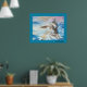 Une belle et élégante peinture d'un cheval blanc au milieu des vagues de la mer dans les tons de bleu avec un ciel rose. de ma collection d'animaux.Cette affiche a un cadre bleu.