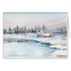 Cabine congelé de lac - cette peinture d'aquarelle dépeint une scène de neige d'un cabine rouge rustique de pays du côté d'un lac. La neige tombe et il y a une ligne des arbres à l'arrière-plan avec un contour faible des crêtes de montagne plus en arrière. Imprimé d'une peinture originale de beaux-arts sur le papier par JC Prida.