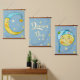 Trois tapisseries suspendues qui correspondent à la pépinière de votre petit. Lune avec étoiles, Dream Big, et une autre lune avec un visage souriant avec étoiles, les couleurs sont bleu et jaune.