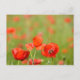 Carte postale de fleurs de pavot rouge vibrantes dans un champ vert plein de pavots. Il a une forte émotion de bonheur, printemps et été.