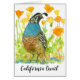 Carte de voeux ornée d'un Quail de Californie aux plumes colorées, posée sur une parcelle de fleurs de pavot orange vif inspirée de l'oiseau d'état et de la fleur de Californie dessinée à l'encre et peinte à l'aquarelle.