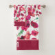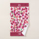 Cette serviette de bain colorée de 3 pièces a des images de pavot à l'aquarelle fleurie violette, rose et mandarine qui remplissent le motif. Avec les différentes images de pavot sont des feuilles et des tiges vert doux. C'est presque un kaléidoscope de couleur, et va certainement égayer n'importe quelle salle de bain. Sur la serviette de bain et la serviette de bain, chaque extrémité a une bordure solide assortie avec votre monogramme. Assurez-vous de voir le rideau de douche et le tapis de bain assortis dans notre magasin.