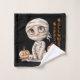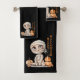 Citrouille Perch Black Bath Towel Set Une momie aux yeux larges enveloppée de bandages blancs doux se trouve doucement sur le sol, tête inclinée avec le charme tranquille. À côté du personnage se trouvent deux citrouilles sculptés, l'un empilé dans un dessin à deux niveaux, à côté d'un tout petit crâne et de feuilles d'automne éparpillées. La palette feutrée et le style fantaisiste mêlent le mal d'Halloween à la chaleur saisonnière, capturant un moment de calme et de douceur éffrayante dans un cadre d'automne douillet.