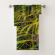 Cet ensemble de serviettes de bain comprend une photo originale de palmiers d'Areca, originaires des forêts tropicales des îles de l'Asie du Sud-Est. Les maigres feuilles verts jaunes font des motifs intéressants, avec leurs troncs pâles entre les, créant une atmosphère tropicale.