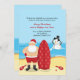 Un joli Noël, faire-part émouvante pour ceux qui se déplacent vers un climat chaud. La carte présente Père Noël à la plage avec sa planche de surf et un bonhomme de neige qui fond dans l'océan chaud.