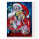 O bold alphabet initial lettre de Noël monogramme design .Peinture acrylique colorée, lunatique et artistique, Père Noël joue du violon dans la nuit d'hiver enneigée, un hibou, ornements floraux, rubans rouges, arcs, chat, plantes d'hiver, baies sèches dans rouge vif, vert, blanc, bleu, jaune couleurs. par Bulgan Lumini (c) com
