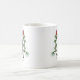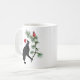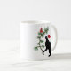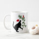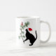 Un chat noir portant un chapeau de Père Noël tient une branche à feuillage persistant avec un oiseau cardinal rouge sur cette tasse de vacances amusante.