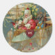 Voici Père Noël ! Il dirige son appareil volant extraordinaire à travers le ciel nocturne. Étoiles, serpentins et décorations fantaisistes se succèdent sur le pont de l'avion et son lot de jouets merveilleux pour Noël matin. L'image restaurée d'une carte postale victorienne présente un arrière - plan glacé, des accents dorés et de belles couleurs vives. Il est encadré de glace et d'ornements avec un village de Noël en arrière - plan.