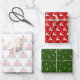 Profitez d'un petit humour de vacances pop culture avec ce design qui contient les mots "Père Noël est à venir. Il boit du cacao et il connaît des choses" dans une police d'imaginaire familière. La typographie est en rouge de Noël et noir et au-dessus des mots est une silhouette verte de forêt d'un renne contre un arrière - plan blanc. La deuxième feuille est composée de silhouettes de rennes blancs répétées contre un arrière - plan rouge et la troisième est verte de forêt avec des pins épars.
