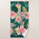 Le mignon perroquet motif sans couture est posé sur des feuilles verts et des fleurs roses. Dessin animal à plat sur arrière - plan vert