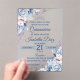 Celebrate her unforgettable milestone with this elegant personalized acrylic Quinceañera invitation. Designed on clear acrylic with soft blue and blush florals, this invitation blends modern sophistication with timeless charm. The delicate floral corners frame your event details beautifully, while the transparent acrylic adds a luxurious, keepsake-worthy touch.