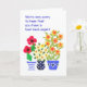 Une carte de voeux lumineuse et gaie pour n'importe qui qui souffre avec un dos du mauvais, avec trois pots de fleurs colorées, d'un collage de papier peint à la main par Judy Adamson.