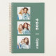 Customisez facilement ce planificateur moderne en remplaçant les trois exemples d'images par vos photos carrés préférées. Ajoutez votre nom ou vos initiales de monogramme et l'année en typographie blanche croustillante sur un arrière - plan vert eucalyptus tendance.
