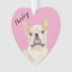 Je suis amoureux de cette photo d'aquarelle magnifiquement détaillée d'une frenchie fawn, bronzée, crème ou taureau français sur un coeur rose doux! Personnalisez ces ornements pastel et faites la belle liste cette année ! Pour les cadeaux parfaits, jumelez-le avec un article de la collection pour un soin ménager, douche nuptiale, enseignant, belle-mère, mari, petit ami, père Noël secret, sympathie, ou un cadeau difficile à acheter! Pour voir plus de travail et pour en savoir plus sur cette artiste, visitez son site : www.theprintsprincess.com et www.instagram.com/theprintsprincess