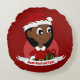Coussin ronde avec l'illustration d'une jolie fille noire souriante et souriante aux cheveux longs, elle porte un costume de Père Noël rouge et blanc et tient un cadeau; avec le modèle texte modifiable pour votre nom ou message, Noël design avec un arrière - plan rouge