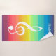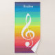 A personalized colorful music design featuring a large white treble clef musical note on a background pattern of watercolor stripes in the colors of the rainbow. Customize the text with the name of the musician or music lover to create a personalized music vend