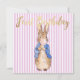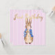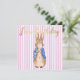 Peter le lapin souffle une gomme à bulle rose avec un arrière - plan à rayures roses. Un cadeau de baby shower unique !