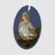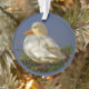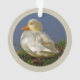 Un mignon petit canard blanc est assis sur le rivage et semble prêt à s'endormir.