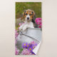 Un jeune chiot Beagle aux yeux de chiot est assis dans une églises de lait et de fleurs roses L'Beagle est une race de chien de scène au tempérament doux.  Une jolie photo de chien prise par Katho Menden. Cette serviette de bain (serviette de bain, serviette et linge de toilette) est une idée cadeau pour les amoureux de les chiens.