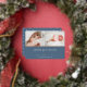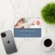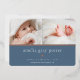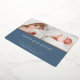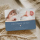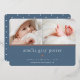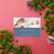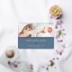 Faire-part de naissance douce et élégante présente deux photos de nouveau-nés alignées côte à côte, avec une bande de feuille d'or rose en dessous. Personnalisez avec le nom du bébé, les statistiques de naissance, et un message de famille, orné d'un petit coeur rose en feuille d'or sur un arrière - plan bleu poussiéreux.