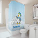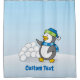 Petit pingouin avec boules de neige agitant rideau