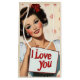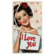 Illustration dynamique dans le style pin-up classique des années 1950. L'image présente une femme glamour aux boucles vintages, au maquillage audacieux et au sourire radieux. Elle tient une pancarte avec un message d'amour, "Je t'aime", sur fond de roses roses délicates et roses. L'esthétique générale capte l'atmosphère romantique et ludique de l'art pin-up du milieu du siècle.