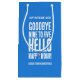 Célébrez la retraite d'un futur ex-collègue avec ce drôle de sac cadeau de vin, qui présente le sentiment, "Au revoir neuf à cinq Bonjour à Happy Hour" dans une police blanche, de style grunge, avec un martini pomme intelligemment debout pour le "Y" dans "Happy" sur arrière - plans alternant bébé bleu et blanc. Reverse affiche un design identique. Design © W.H. Sim. Voir plus sur zazzle.com/wordsofwhimsy
