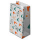 Ce sac cadeau a un design moderne atomique du milieu du siècle de formes boomerang, antennes, et starbursts en turquoise, orange.