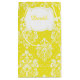 Premier sac cadeau de Merci de cheveux blond de communion à présenter à vos invités après la cérémonie avec un motif Damas jaune. Tout le texte peut être modifié selon vos propres exigences. Graphiques de BlackCatsMedia et Zenentrepdesigns.