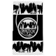 Cette nouvelle illustration en noir et blanc de la ligne d'horizon de Boston présente de nombreux points de repère familiers, dont le bâtiment du capitole, la tour de la maison personnalisée, les bâtiments Hancock, Old Hancock et Prudential, ainsi que le pont Zakim et le quartier financier.