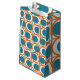 Ce sac cadeau a un design moderne du milieu du siècle de cercles orange ouvert avec des cercles turquoises solides qui traversent le motif avec des lignes verticales turquoises et des lignes horizontales orange.