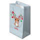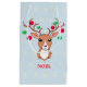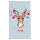 Cerf de Noël sur arrière - plan bleu clair avec sac cadeau motif de flocon de neige. Le texte peut être customisé.