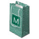 Un sac cadeau motif moderne vert et blanc chevron. Rendez-le personnel en ajoutant votre initiale au carré monogrammé.
