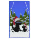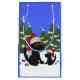 Découpez le design des vacances avec deux chiens dans une forêt enneigée. Un grand chien et un petit chien portent chacun un chapeau de Père Noël avec des empreintes de pattes à travers la neige.
