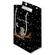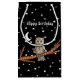 Ce sac cadeau est noir avec des étoiles blanches et une lune de croissant blanc avec un hibou brun portant un collier de cristal violet assis sur une branche d'arbre. Customisez le texte Joyeux anniversaire avec le modèle.