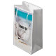 Anniversaire merci sac cadeau avec une magnifique photo. Eau bleue tropicale et surf mousse dans l'arrière - plan. Une collection de coquillages et de tiges s'étend sur une plage de sable blanc.