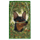 Portrait d'une Miniature Pinscher contre une couronne verte de Noël parsemée de baies rouges.