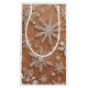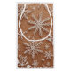 This delicate composition celebrates the intricate beauty of nature through a series of highly detailed snowflakes set against a warm, sandy ochre background. Each snowflake is rendered with fine, lace-like precision in a crisp white, creating a striking contrast that emphasizes their unique hexagonal symmetry. The background features a subtle, speckled texture reminiscent of falling frost or a light dusting of snow, while the overall warm tone lends a sophisticated, vintage holiday aesthetic to the piece. The arrangement is organic yet balanced, capturing a frozen moment of winter elegance.