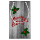 Sac cadeau de Noël avec planches en bois gris, baies sèches avec feuilles, typographie disant "Merry & Bright".