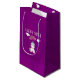 Un sac cadeau avec une jolie illustration d'une licorne blanche assise sur sa croûte, souriante et joyeux. Des nuages souriants et un arc-en-ciel au-dessus. Texte : Happy Vibes. Image de levage adorable Avec un arrière - plan d'aquarelle rose violet.