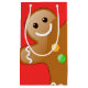 Pain d'épices homme avec bouton de goutte vert et orange sur arrière - plan rouge.