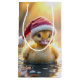 Un canard moelleux portant un chapeau de Père Noël flotte sereinement sur un étang entouré de nénuphars.