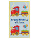 Joyeux anniversaire pour tout garçon ou fille qui aime des trains. Comporte un train coloré mignon de jouet de bande dessinée. A un rouge et le moteur jaune, les roues jaunes, et lui tire des piles en vert, orange, le pourpre et le rouge. Les ballons volent de l'arrière saison. Tous sur un arrière - plan ou un changement bleu-clair et jaune à n'importe quelle couleur, soient sûrs de faire les deux côtés. Ajoutez juste le nom d'anniversaire ou vos mots. Le style et la couleur des textes peuvent être changés et classés pour s'adapter si nécessaires. Les répétitions de conception sur le dos, s'assurent que des changements sont faits des deux côtés. La conception adapte les petites et moyennes tailles de produit seulement. Amusement et coloré pour toute anniversaire, occasion, ou partie.